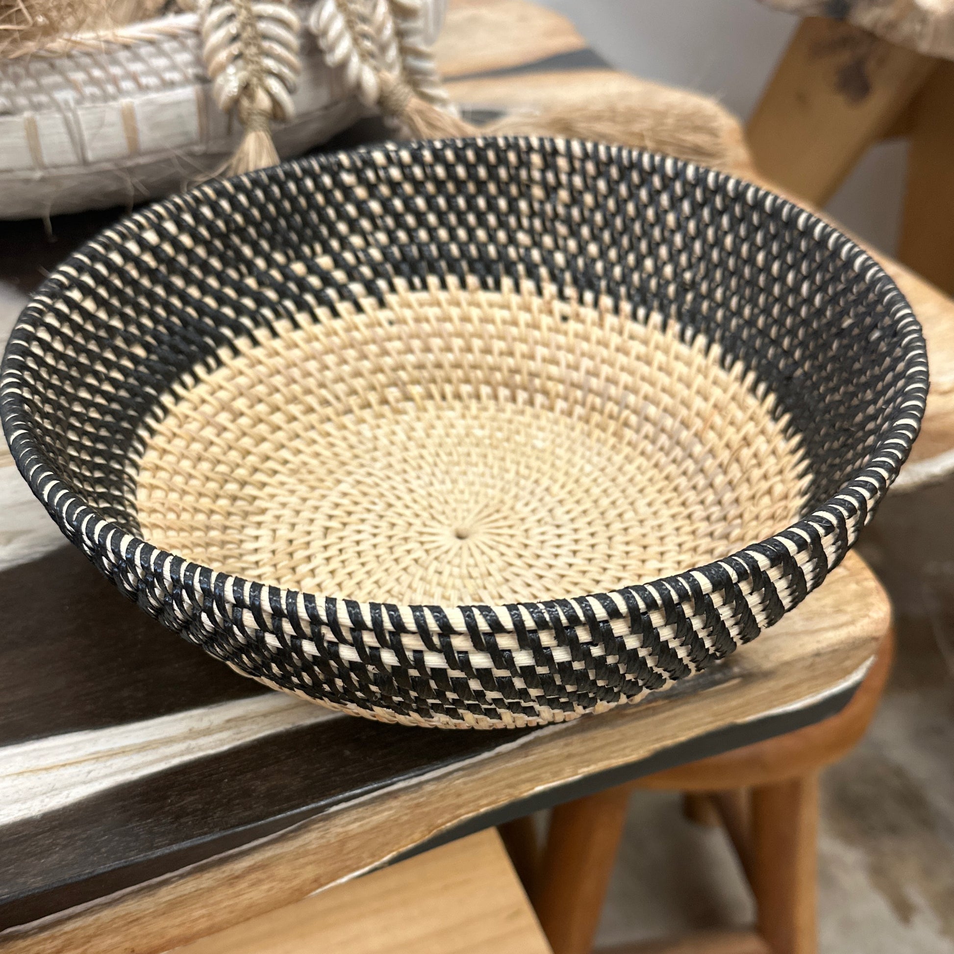 Its black rim adds a touch of sophistication, creating a striking contrast against the natural rattan weave.