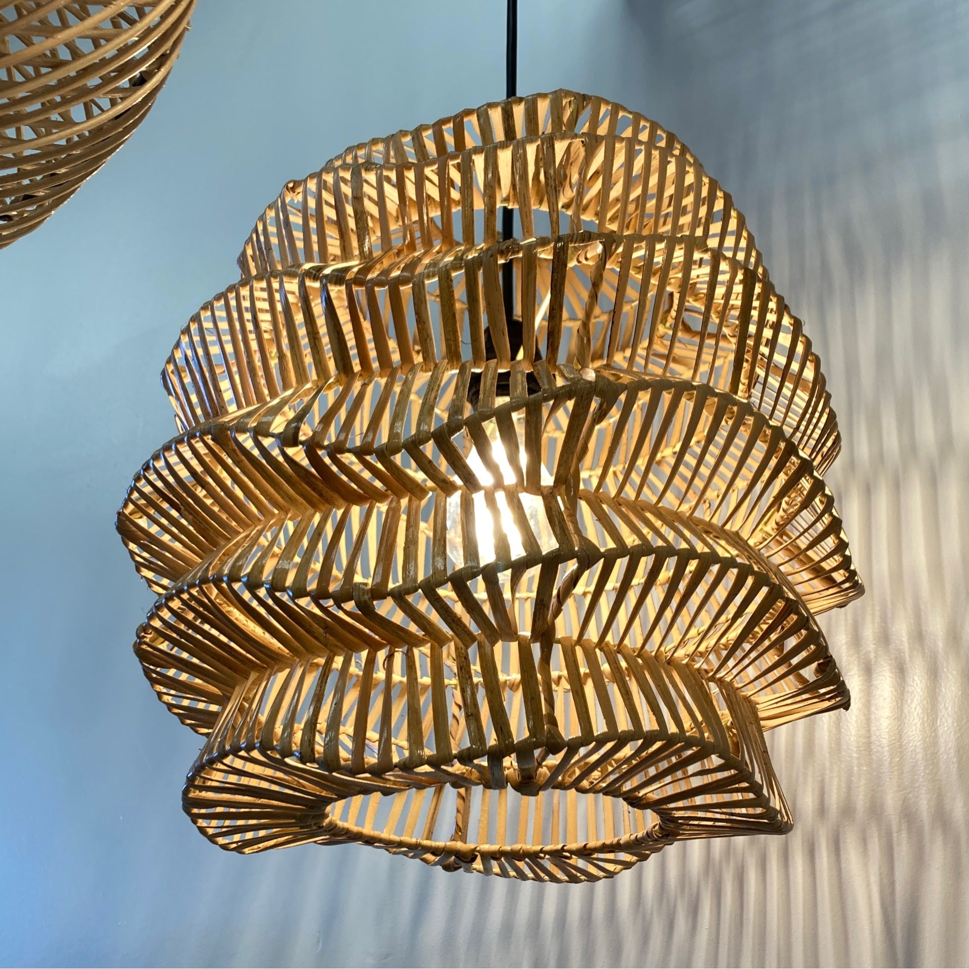The warm glow of the light filtering through the rattan creates a cozy and inviting atmosphere, perfect for relaxing evenings or intimate gatherings.