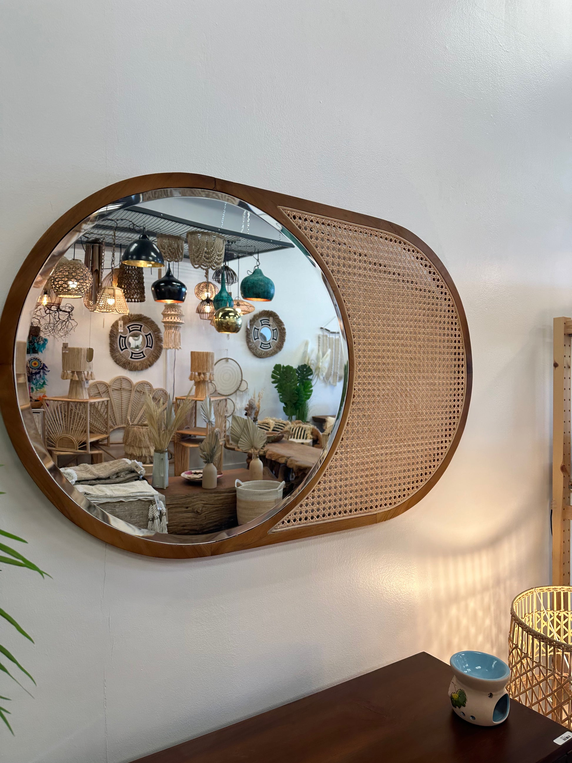 Add a touch of bohemian charm to your décor with the Round Mirror with Net. This unique mirror features a round rattan frame, intricately woven with a delicate net, creating a visually captivating statement piece.
