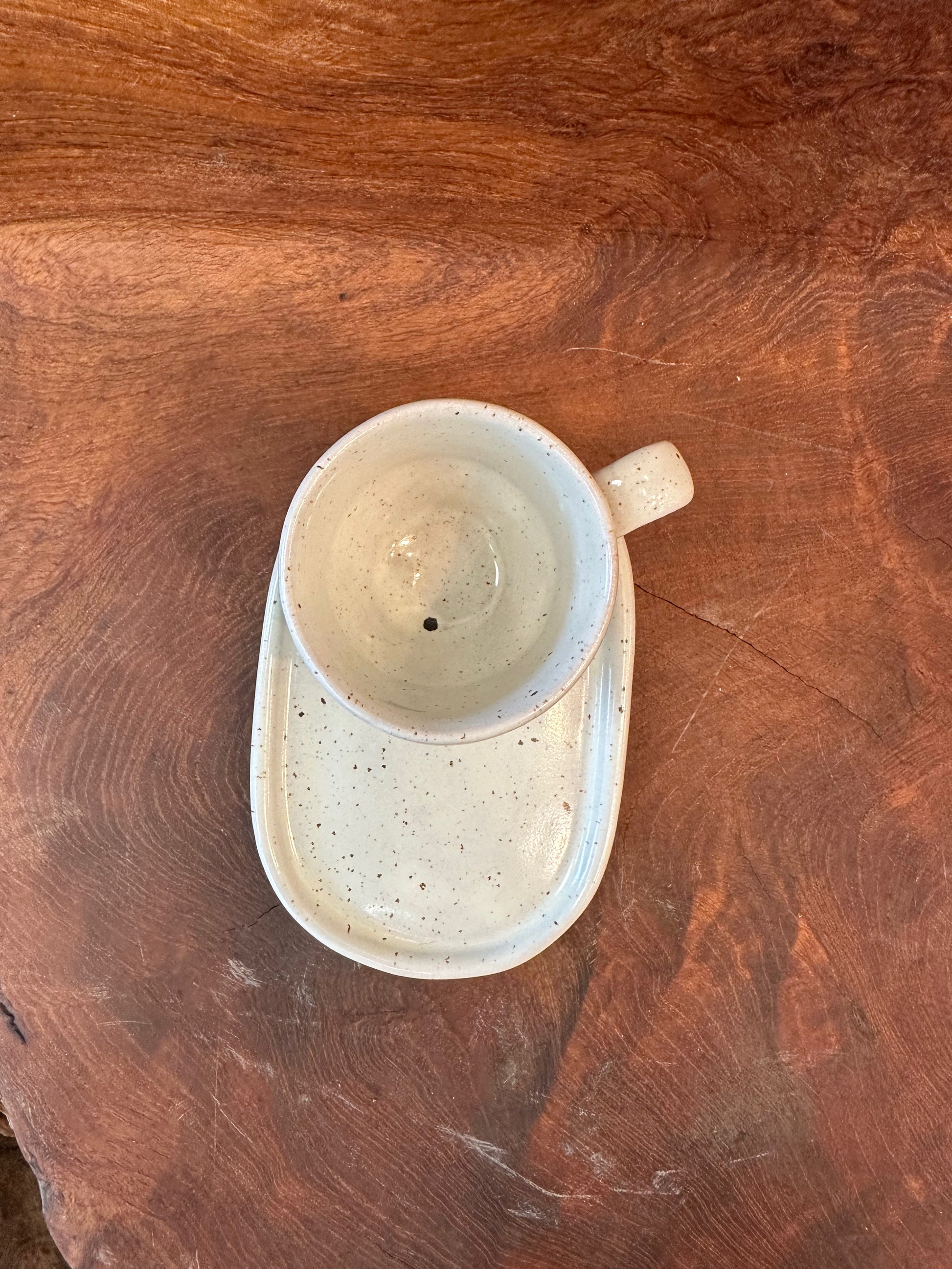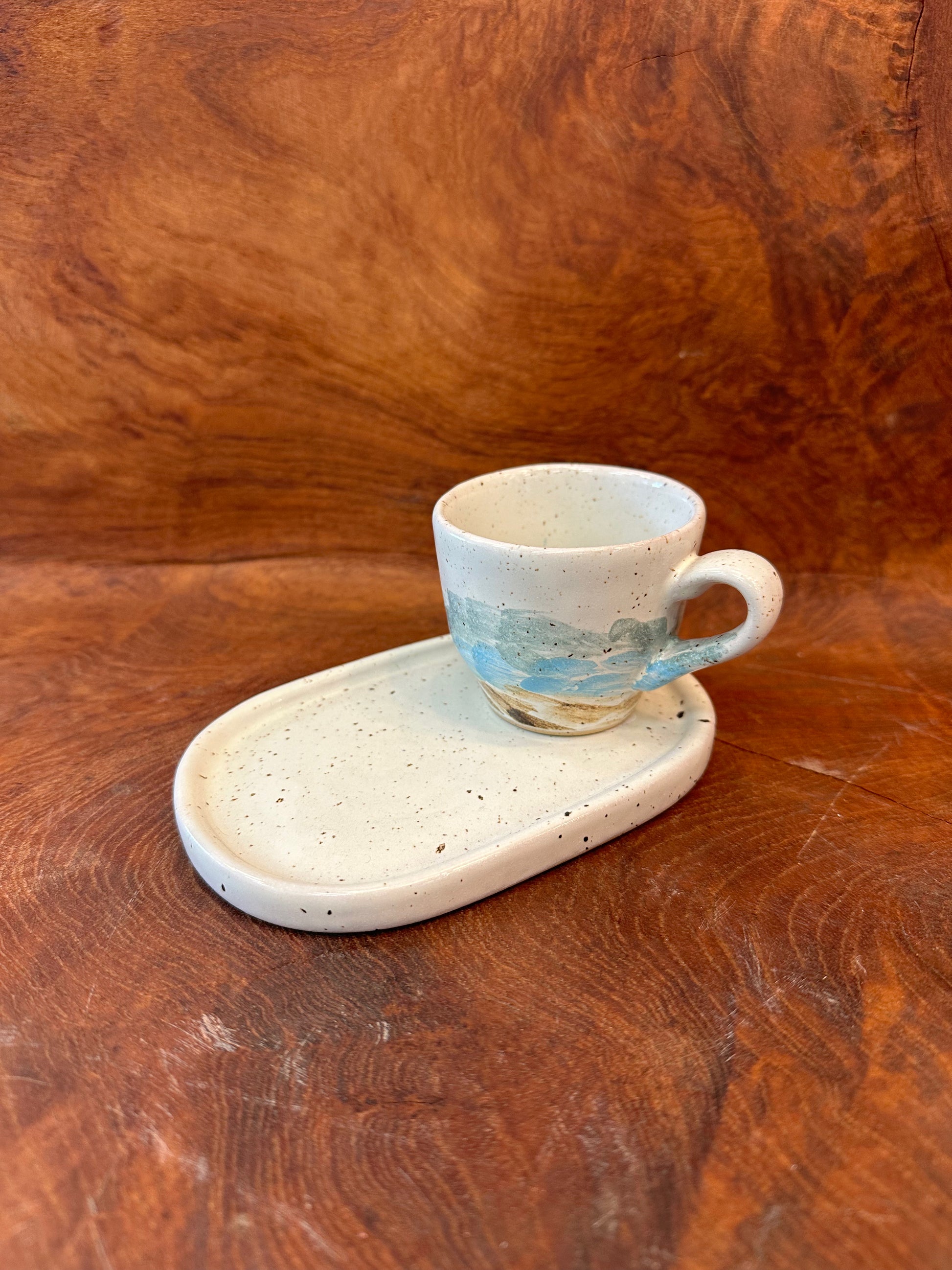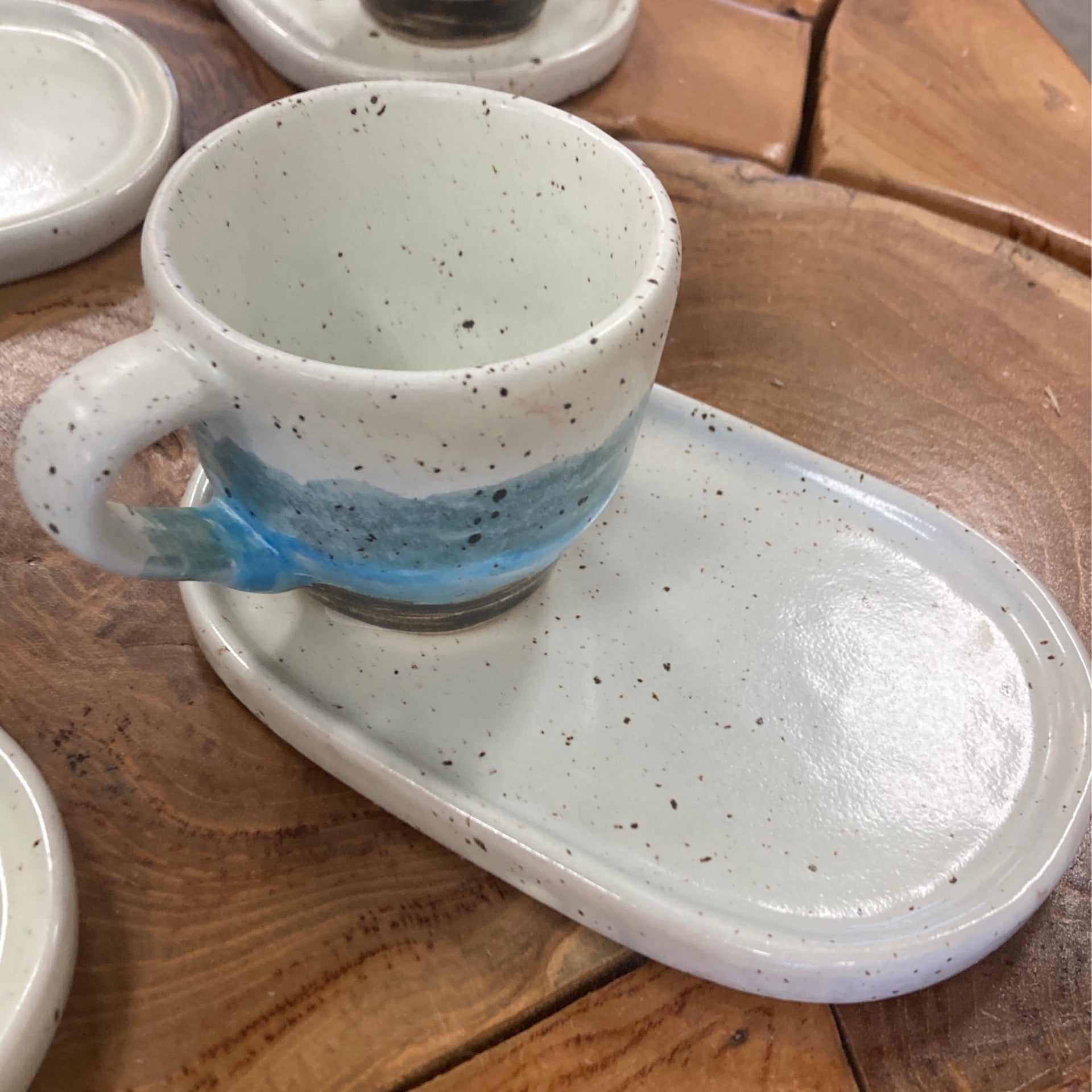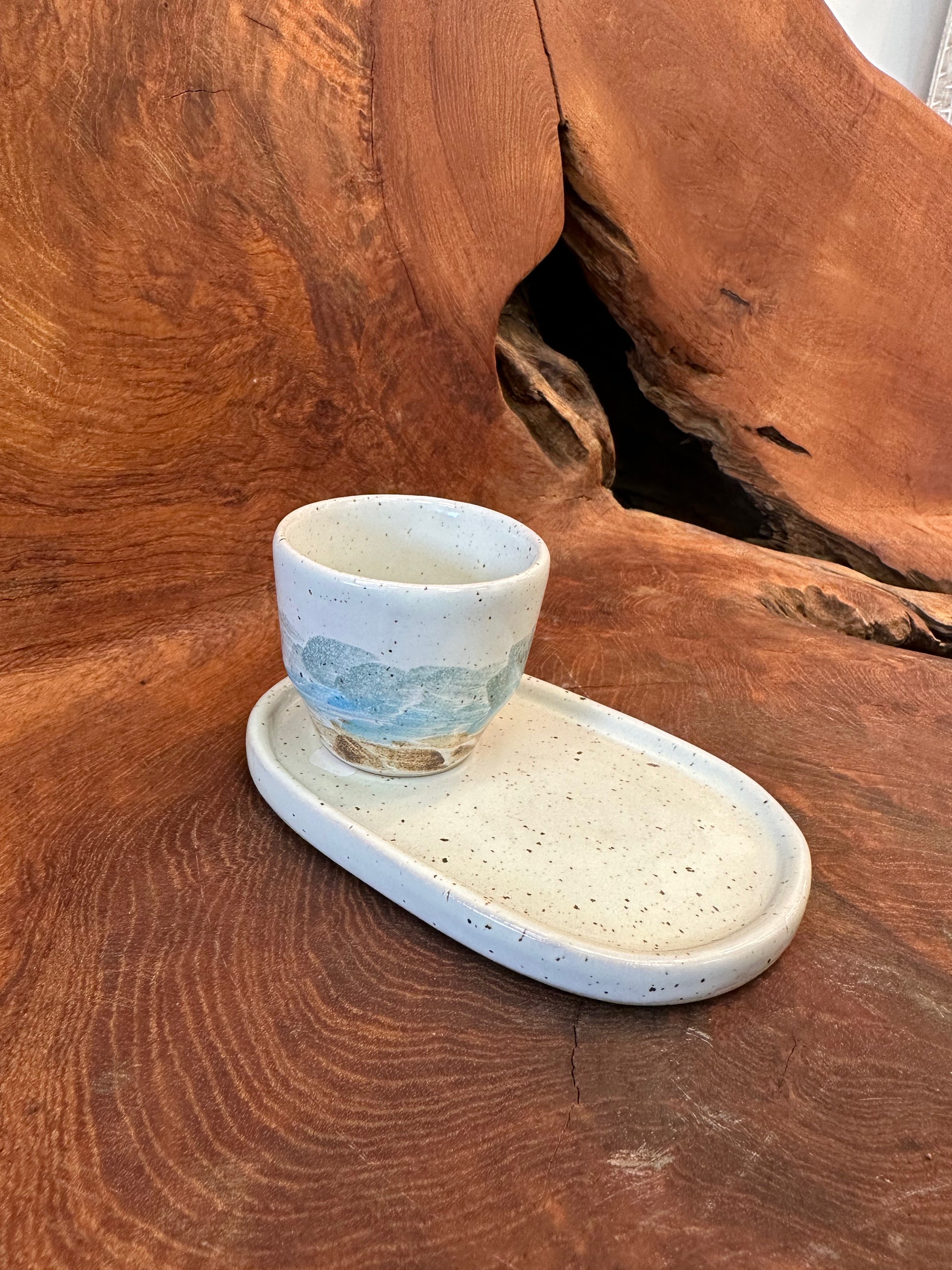 This exquisite set, featuring a cup and base with dimensions of cup 2 in x 2.5 in and base 0.5 in x 5.5 in x 3.5 in, is artfully crafted to reflect the serene beauty of Ubud’s sacred Monkey Forest.